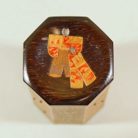 金襴(錦)を貼り付け、木地蝋漆で塗り込めた八角食籠です。