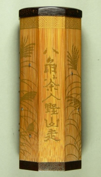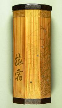 旅宿茶入あるいは旅宿茶器と呼ばれる茶入は、遠州好みが本歌とされています。竹を八角に削った身に鉄刀木一文字の蓋が付いた茶入で、