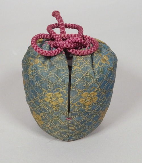 茶箱の中に組まれて伝存していました。浅葱地青海波梅模様緞子の仕覆が元から附属しています。