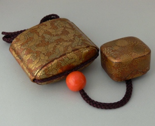 緒締には珊瑚珠、根付は菊唐草蒔絵の箱根付が取り合わされています。