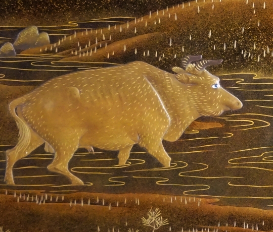 黒蝋色塗地に流水と土坡を肉合研出蒔絵で表し、桃樹と若松、2頭の牛を焼金粉と青金粉の高蒔絵で表しています。