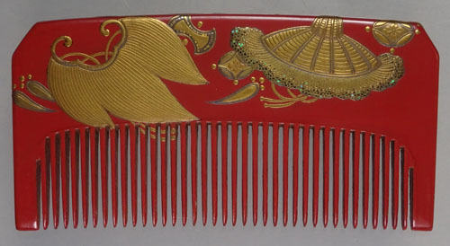 柴田是真の高弟・池田泰真による真っ赤な朱漆塗地に高蒔絵と切金・切貝で緻密に宝尽を表した豪華な挿櫛です。