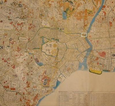 拡大地図で中央にあるのが浅草御門と浅草橋で、橋を渡って左に行った川沿いの、黄緑で囲ったところが是真宅です。