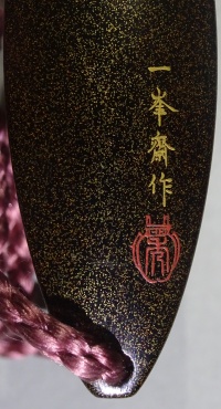 底部右下に小字で「一峯斎」と蒔絵銘があり、「典厚」の朱文方形印が朱漆で書かれています。