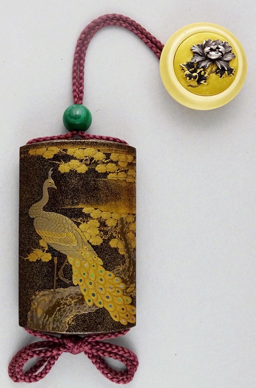 唐松に雌雄の孔雀を高蒔絵で緻密に表した豪華な印籠で、この工人による最高傑作です。