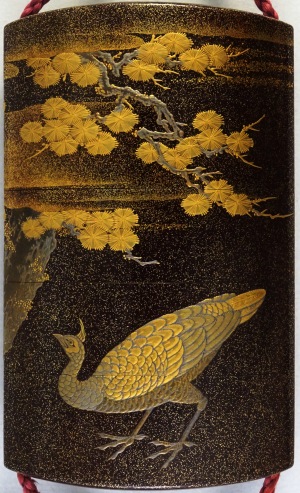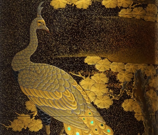 高蒔絵で唐松に孔雀を表しています。