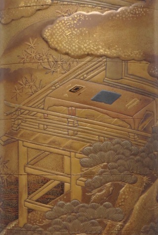 合口の高い精度、高蒔絵に切金を置いた雲や遠山、そして木々、高蒔絵の松、肉合研出蒔絵の流水や土坡などの