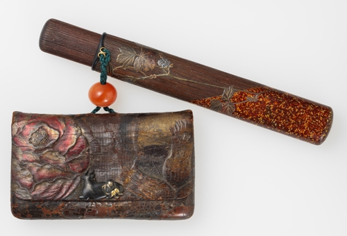 瑪瑙の緒締と加納夏雄作牧童前金具の金唐革煙草入を取り合わせています。