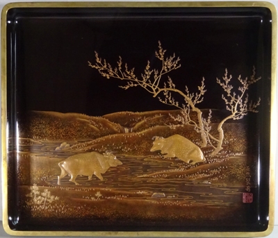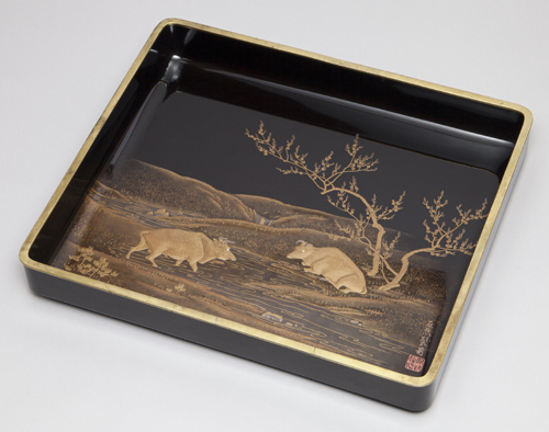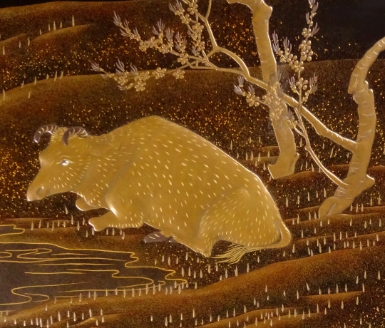 黒蝋色塗地に流水と土坡を肉合研出蒔絵で表し、桃樹と若松、2頭の牛を焼金粉と青金粉の高蒔絵で表しています。