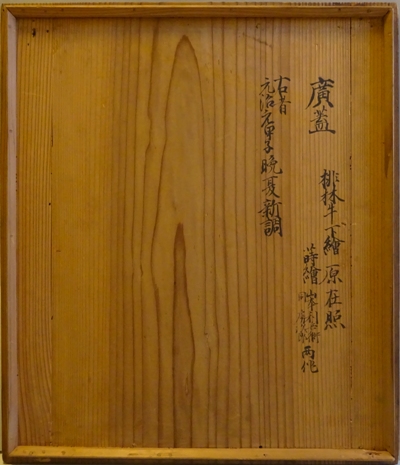 樅製の外箱には、表に「帛紗 並 廣蓋/沢田」、見返しに「廣蓋 桃林牛下繪 原在照/蒔繪 山本利兵衛/同房次郎/両作/右者/元治元甲子晩夏新調」