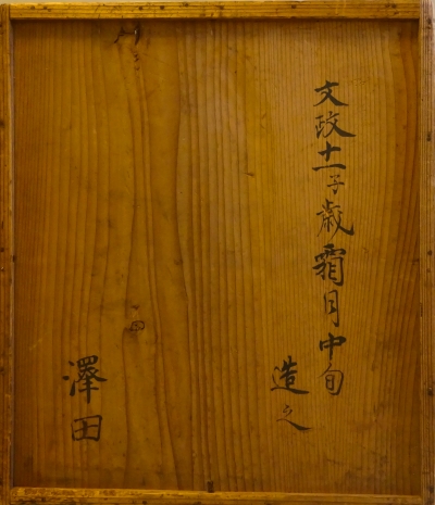 、底に「文政十一子歳霜月中旬/造之/澤田」との墨書があります。