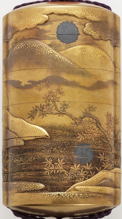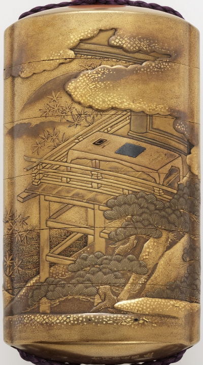 合口の高い精度、高蒔絵に切金を置いた雲や遠山、そして木々、高蒔絵の松、肉合研出蒔絵の流水や土坡などの