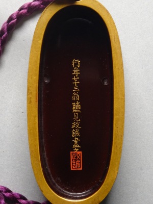 「蜻蛉蟷螂蒔絵印籠」の蓋裏にある「行年七十五翁鹽見政誠畫」に添えられた