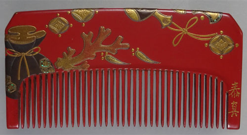 柴田是真の高弟・池田泰真による真っ赤な朱漆塗地に高蒔絵と切金・切貝で緻密に宝尽を表した豪華な挿櫛です。