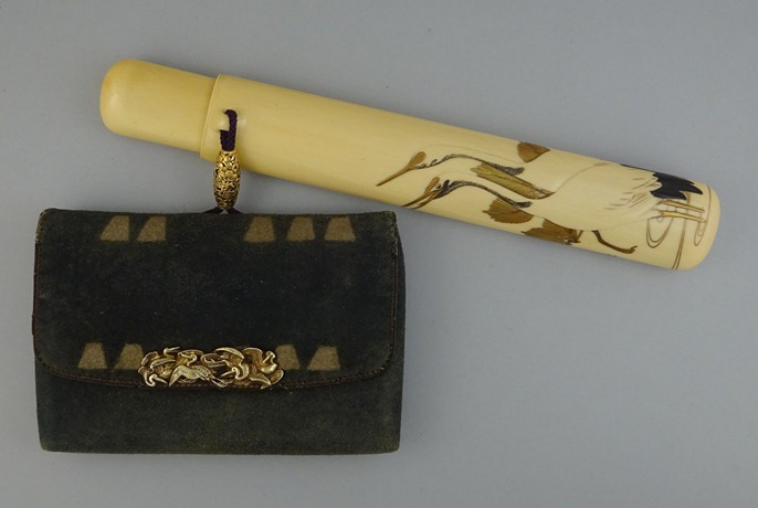 金無垢松竹梅透彫の緒締と鉄地松鶴前金具の煙草入を取り合わせています。