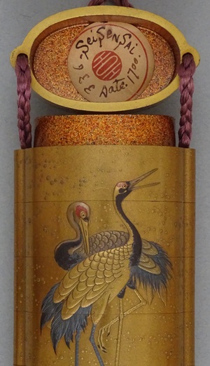 豊川楊溪(2代)が徳川将軍家のために作った12本揃いの「定家詠花鳥十二ヶ月蒔絵揃印籠」のうちの1本です。