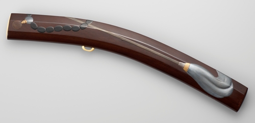 三味線工・石村近江が作った木地に豊川楊溪(2代)が蒔絵した茶刀で、数珠に払子が高蒔絵で表されています。富裕な大名などの特注品とみられます。