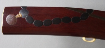 珊瑚珠の緒締と葵蒔絵根付が取り合わされています。