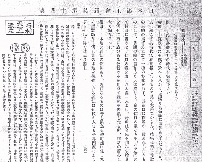 『日本漆工会雑誌』第14号には、「品定め」として記事があり、柴田令哉と赤塚自得(1871〜1936)とのやりとりが記されています。