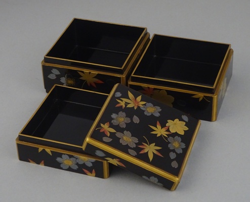 正方形、3段の印籠蓋造で、角を唐戸面としています。底には低い脚が付いています。