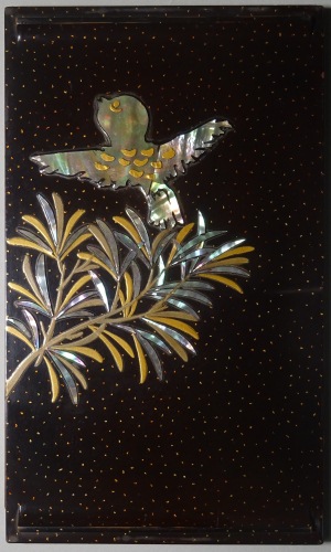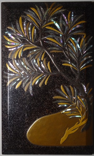 高蒔絵と螺鈿で槙を表しています。